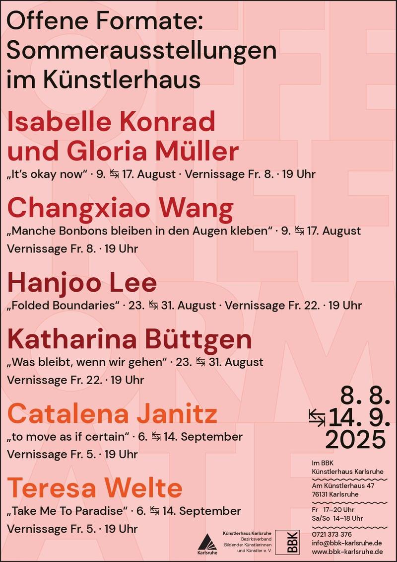 Unter dem Titel "Offene Formate" haben im Zeitraum vom 8. August bis zum 14. September Künstlerinnen und Künstler die Möglichkeit, die Galerieräume des Künstlerhauses für ein Ausstellungsvorhaben zu nutzen - auch ohne Mitgliedschaft im BBK Karlsruhe. Somit können sechs verschiedene Ausstellungen, teilweise parallel, stattfinden. Gezeigt werden neben altbewährten Präsentationen auch experimentelle und über die klassischen Ausstellungsformen hinausgehende Formate.