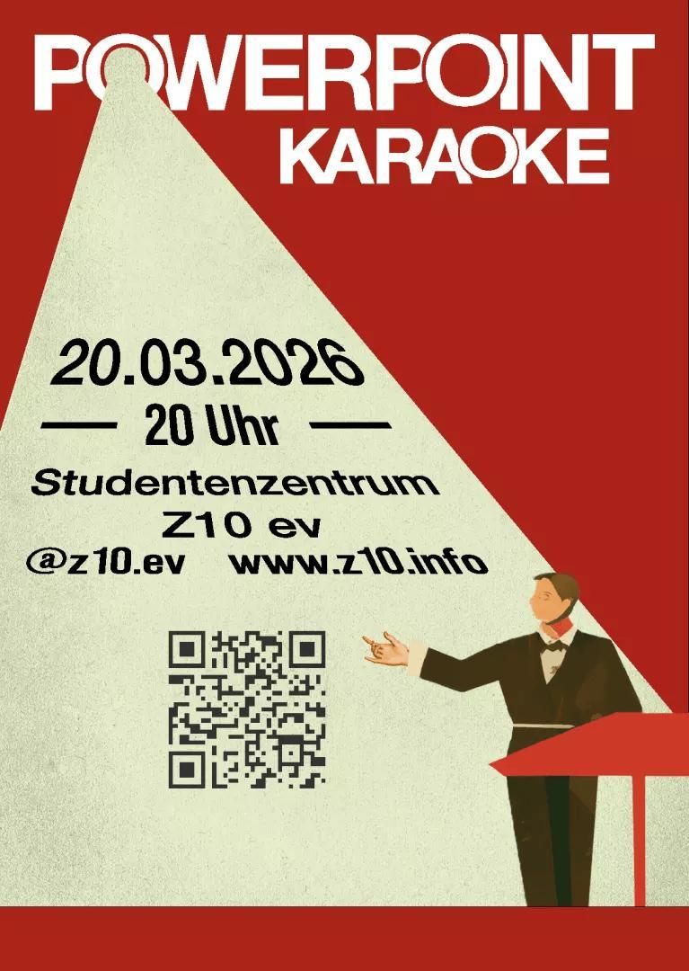 Auch dieses Semester heißt es wieder „Willkommen zu meiner Präsentation" - im Z10 ist wieder Powerpoint-Karaoke Night. Es ist wieder Zeit zu präsentieren, jedoch ohne Vorbereitung! Halte eine Präsentation, die du zuvor noch nicht gesehen hast. Du allein bestimmst den Verlauf durch deine Improvisationskünste. Bist du bereit? Dann Folie ab!