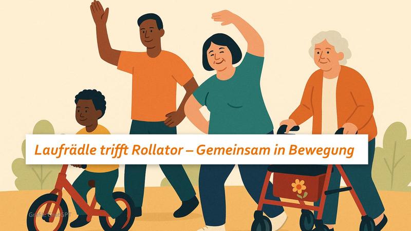 Ob mit Laufrädle oder Rollator – wir bringen Klein und Groß gemeinsam in Bewegung. Freu dich auf Spaziergänge, Bewegungsübungen und spielerisches Gedächtnistraining. Ein Angebot für alle Generationen – draußen, gemeinsam, mit Freude!