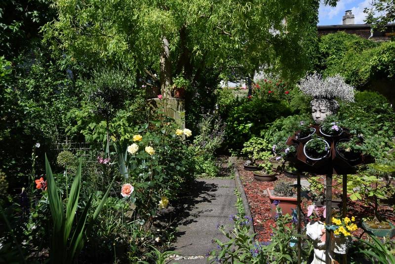 Dieser etwa 150 Quadratmeter große Garten ist Teil eines Blockinnenhofs, den ein Mieter achtsam unterhält und pflegt. Die anderen Hausbewohner erfreuen sich so an einem grünen und blühenden Raum vor ihrem Zuhause, der Energie spendet. Während der Besichtigungszeit kann man direkt von der Haustür bis zum Hof durchgehen. Neben einem Sitzplatz ist dort ein Auslauf für die kleinen Beiertheimer Idyll beheimateten Schildkröten und davor ein Beet mit mehreren Bonsaipflanzen. Ein Teil der Pflanzen in Kübeln oder Töpfen ist nicht winterfest und überwintert im Keller. Im Sommer werden einige Kräuter, Stauden und Gehölze sowie verschiedene Sommerblumen und Tomaten gepflanzt. Einen zweiten Teil des Hofes betreuen Mieter des Nachbarhauses.