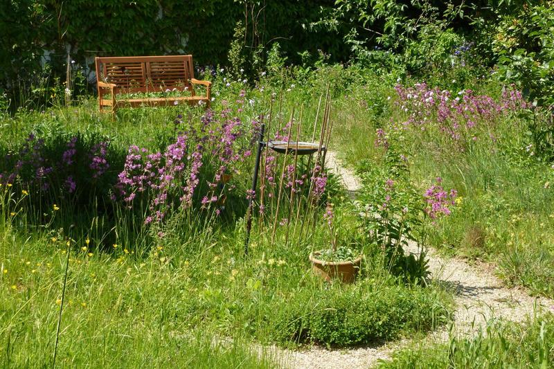 Der Großteil des circa 400 Quadratmeter großen Hausgartens ist als Naturgarten mit Wildwiese und einem Trockenbeet entlang der Einfahrt sowie verschiedenen Wildrosen, Rankpflanzen, Stauden, Kräutern, Sträuchern und Obstbäumen angelegt. Die Wildwiese hat der Naturgartenidee entsprechend viele interessante Wildpflanzen. Durch die Blüten und die Wildwiesenstruktur werden im Laufe des Jahres viele Insekten, Bienen, Hummeln und Schmetterlinge angelockt. Ganz unterschiedliche heimische Kräuter haben sich an diesem trockenen Standort gut entwickelt, werden laufend weiter ergänzt und gezielt gepflegt. Mediterrane Arten wie der Mönchspfeffer mit seiner prächtigen Blüte runden die Artenvielfalt ab.