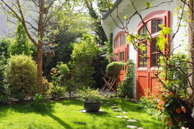 Aus einem grauen Hinterhof wurde ein blühender Garten – aus einem heruntergekommenen Werkstattgebäude eine lichtdurchflutete Kunstgalerie. Betritt man nun durch die einladende Toreinfahrt des Gründerzeitwohnhauses den Garten, verschwinden sofort alle Alltagsgeräusche der Durlacher Allee. Ein geschwungener Natursteinweg führt vorbei an blühenden Büschen, einer Mahonie und einem Gingkobaum zu den einladenden roten Toren des Rückgebäudes. Im Zentrum des sonnigen Gartens spendet ein feingliedriger Ahornbaum Schatten. Kletterrosen und Clematis ranken an den Ziegelmauern, eine große Glyzine erklimmt bereits die dritte Etage des Hauptgebäudes. Wo früher rostige Autos vor sich hin dämmerten, lädt nun eine hölzerne Weinlaube zum Verweilen. Anlässlich der „Offenen Pforte“ ist in der Galerie „Art Tempto“ auch eine Ausstellung mit Bildwerken und Goldschmiedekunst von Rike Riegels-Winsauer zu sehen.
