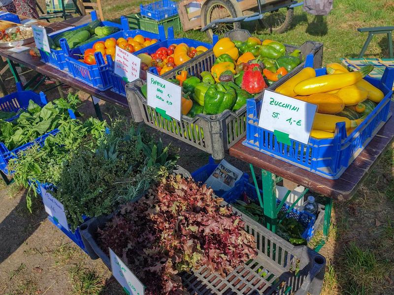 Verkauf von frischem Obst, Gemüse und Kräutern aus dem Sozialen Garten. Der Verkaufsstand befindet sich am Ende des Gartengrundstücks Richtung Wolfartsweier. Zugang über Wettersteinstraße auf Höhe Nr. 43