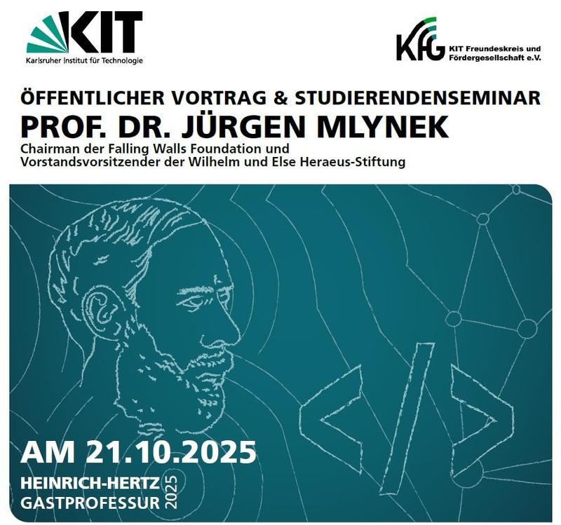 Das Karlsruher Institut für Technologie (KIT) und der KIT Freundeskreis und Fördergesellschaft e.V. (KFG) verleihen die Heinrich-Hertz-Gastprofessur 2025 an Professor Jürgen Mlynek . Mlynek war von 2005-2015 Präsident der Helmholtz Gemeinschaft und ist Chairman der Falling Walls Foundation und Vorstandsvorsitzender der Wilhelm und Else Heraeus-Stiftung.