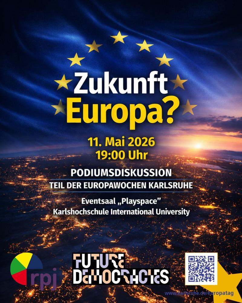 Das Forschungsprojekt Future Democracies der Karlshochschule International University und der Ring politischer Jugend Karlsruhe veranstalten eine Podiumsdiskussion zur Zukunft Europas.